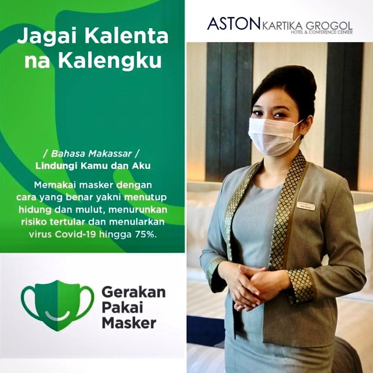Untuk itu Hotel Aston Kartika Grogol ikut mendukung pencegahan penyebaran cirus Covig-19 dengan mengadakan gerakan pakai masker dengan tajuk “Lindungi Aku dan Kamu” Seluruh karyawan ASTON Kartika Grogol Hotel & Conference Center turut berpartisipasi mengunggah foto mereka di sosial media menggunakan bahasa daerah mereka masing-masing. Hal ini dilakukan untuk terus mengingatkan kepada Masyarakat bahwa pentingnya menggunakan masker untuk menjalani aktivitas sehari-hari selama PSBB Transisi maupun pasca pandemi.
